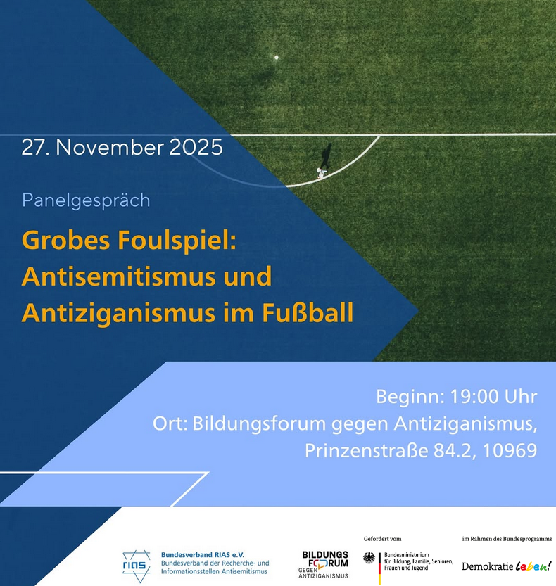 Das Bildungsforum gegen Antiziganismus und der Bundesverband RIAS e. V. laden am 27. November 2025 zu einer Abendveranstaltung unter dem Titel „Grobes Foulspiel: Antisemitismus und Antiziganismus im Fußball“ ein.